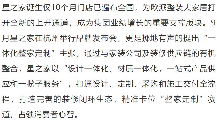 打铁还需自身硬,取得喜人成绩的背后,欧派整装大家居自身“争气”的事实也不容忽视。今年,瞄准行业大势,欧派整装大家居顺势立新推出新品牌——StarHomes星之家,以欧派与星之家双品牌切入整装赛道,实现抢跑,为进入整家定制时代的“正面刚”备足“粮草”。