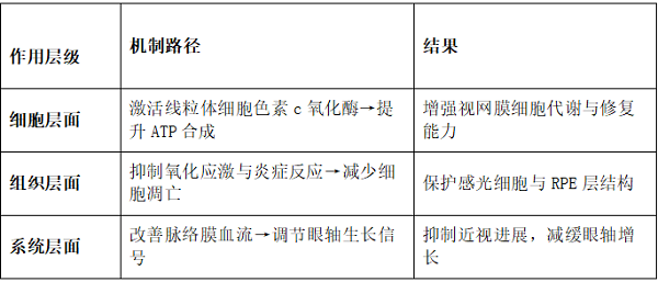 通过光生物调节作用靶向视网膜和脉络膜中的线粒体细胞色素c氧化酶(CCO),CCO吸收红光后,解除线粒体氧化磷酸化的抑制状态,提升ATP生成效率,为视网膜和脉络膜细胞提供充足能量,抑制因代谢不足导致的巩膜缺氧和细胞外基质降解。此外,红光通过降低活性氧(ROS)水平,减轻氧化应激对巩膜成纤维细胞的损伤;同时抑制炎症因子(如TNF-a、COX-1)的表达,阻断炎症信号对巩膜重塑的促进作用从而抑制了近视的增长。