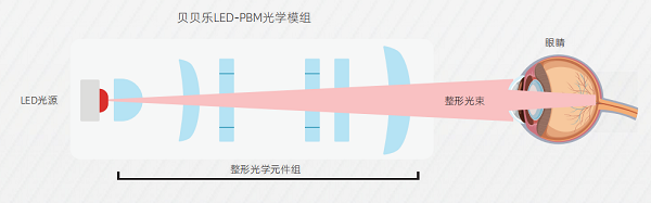 近视防控PBMT中光学设计是至关重要的。即使是同样光源类型相近的功率和波长,由于光路设计不同,在眼底或是角膜/前房的光辐照度可能有巨大差异。在光路设计方面,如仪器的LED光源是经过专业光学元件组精密整形,输出功率稳定、波长精准、辐照均匀的出射光束。该光束经眼睛自然屈光系统(角膜、瞳孔、晶状体、玻璃体)后,在眼底形成均匀光斑,长期使用不会对眼底造成潜在危害,也不会损伤角膜,真正做到“有效且安全”。
