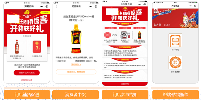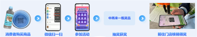 通过“扫盖内码”联动营销活动,完成从“购买”到“私域沉淀”的全链路触达:消费者购买商品→扫码参与趣味活动→抽奖获得“再来一瓶”等福利→前往门店核销领奖。