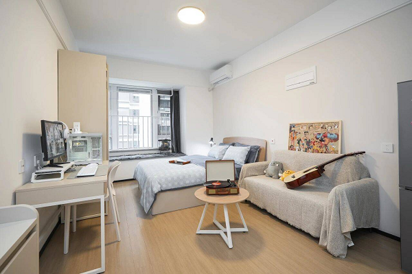 公寓所有户型均为精装全配,臻选品牌家电(空调、洗衣机、双门冰箱、油烟机),全屋家具精心搭配,独立卫浴干湿分离,厨房操作台布局合理,从细节到整体,真正实现无忧拎包入住,让精英人才轻松安家。